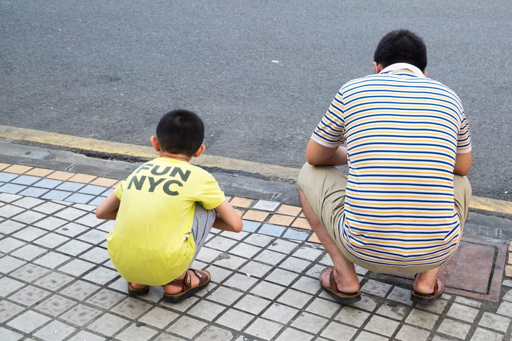 I guess that you have to be born in an Asian family and sit like the little boy and his father since you're a kid to be able to, not only do it, but enjoy it. It seems to be a convenient way to wait for the light to turn green.