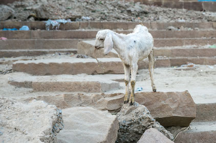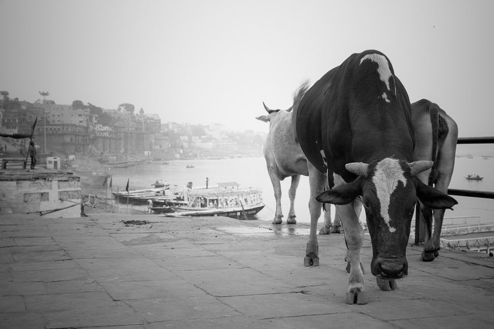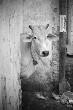 Las vacas son sagradas en India y andan sueltas por todos lados. Hasta en el callejón más pequeño hay una. Sus reflejos deben ser nulos porque la gente, los rickshaws y cualquier otro vehículo simplemente las esquiva. Duermen en la carretera o donde les parezca y se alimentan principalmente de plástico y basura según vimos.